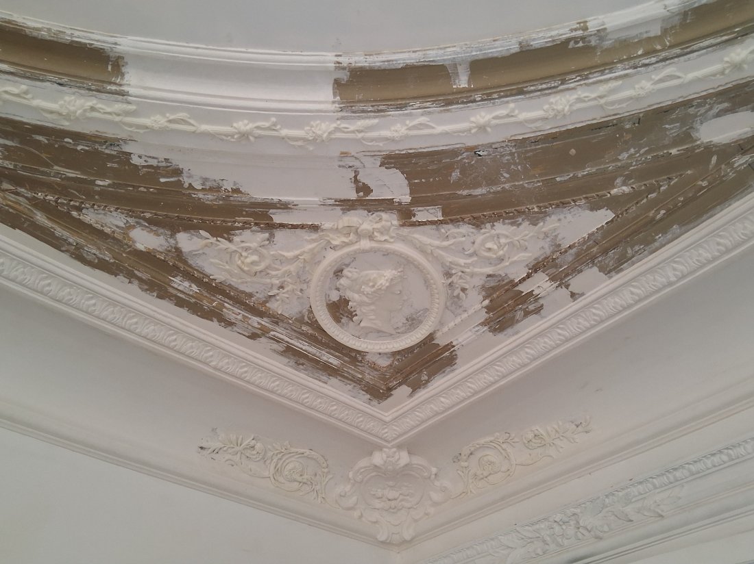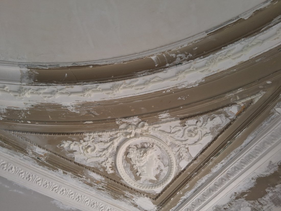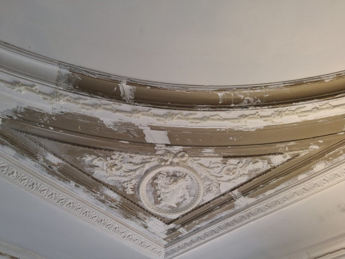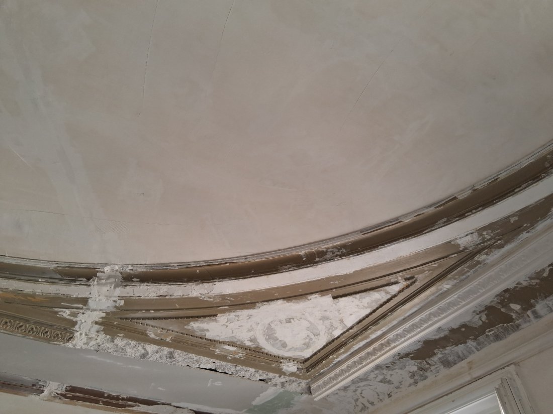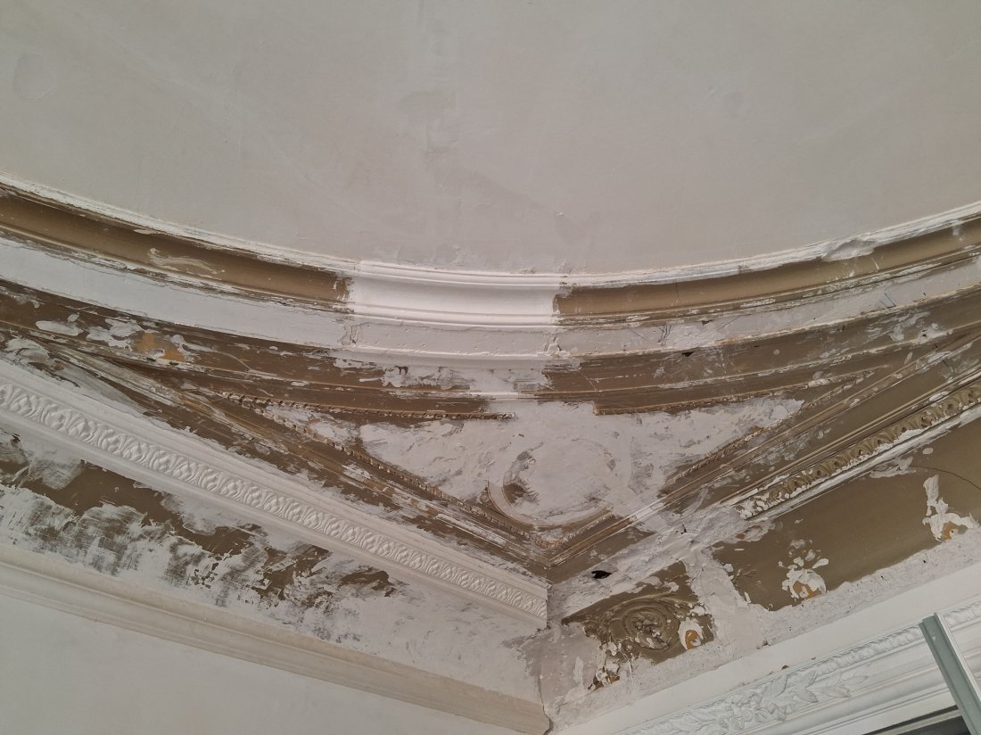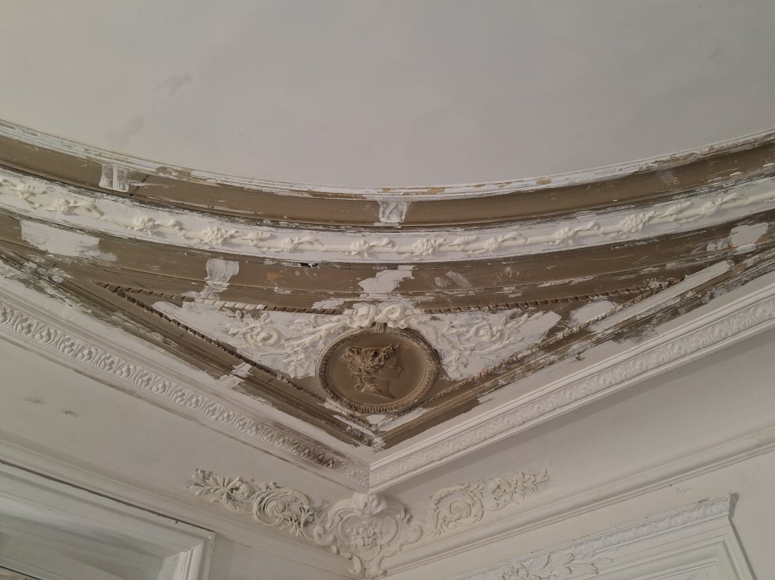 Restauration minutieuse d’une corniche moulurée de style haussmannien, réalisée à l’identique par Staff Plâtrerie Allexandre : savoir-faire artisanal, respect des formes et ornements d’origine.